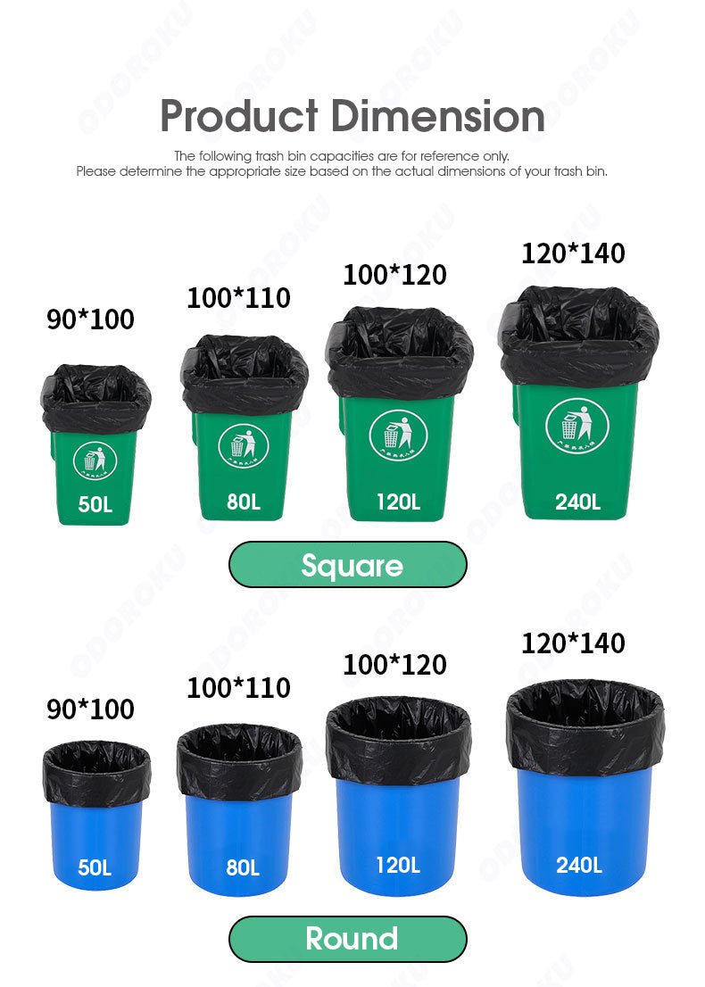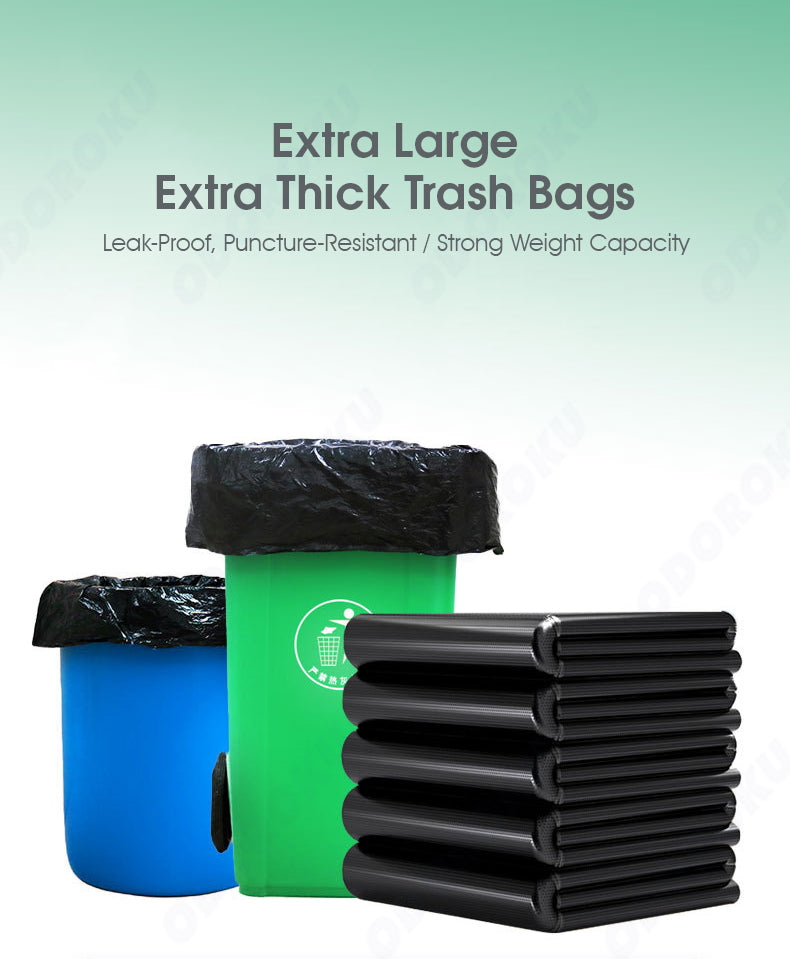 The ODOROKU Heavy Duty Trash Bags are designed for superior strength and reliability, making them ideal for home, office, and industrial use. Crafted from high-quality polyethylene (PE) material, these extra-thick garbage bags are leak-proof and puncture-resistant, ensuring they can handle heavy loads without tearing. Their reinforced durability makes them perfect for managing household waste, lawn debris, yard cleanup, and even industrial trash disposal. Available in multiple sizes, these trash bags fit a variety of bin types, providing a convenient and mess-free waste management solution. Whether for everyday use or heavy-duty disposal, these durable bin liners offer unmatched performance and reliability.
