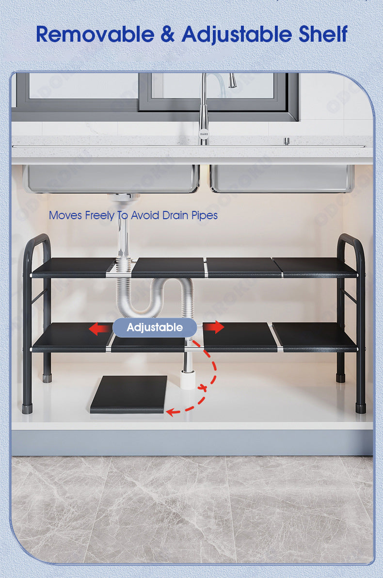Enhance your under-sink area with this expandable and adjustable organizer, designed for easy installation and efficient use of space. Perfect for anyone looking to tidy up their home storage. Each unit comes with up to 8 detachable panels that can be repositioned to accommodate plumbing fixtures or various storage needs. This feature allows you to customize the shelf layout to maximize space and accessibility.