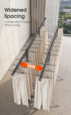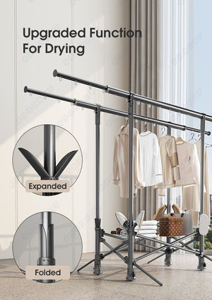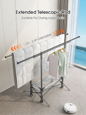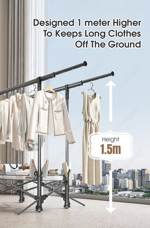 Upgrade your laundry experience with the ODOROKU Foldable and Extendable Laundry Rack. Built with reinforced aerospace aluminum, this rack offers exceptional durability, rust resistance, and high load capacity. It features a 2-tier structure with extended telescopic rods (up to 2.4m) and windproof hooks for secure hanging. Designed at 1.5m height to keep long garments off the floor, it folds down effortlessly for compact storage. Whether drying clothes, bedsheets, or heavy quilts, this rack delivers stability and convenience on wheels.