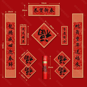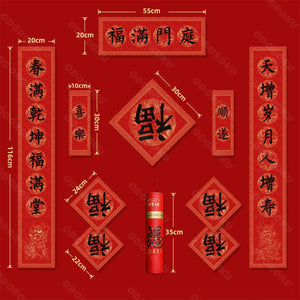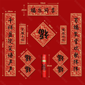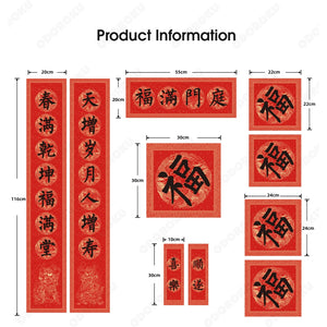 Complete Decoration Set: Includes vertical couplets, horizontal banners, multiple "Fu" squares, and door strips, covering all essential festive decoration needs.