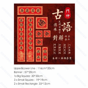 Description: A traditional set with bold gold calligraphy on textured red paper, celebrating Chinese cultural heritage.
