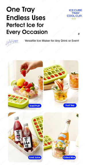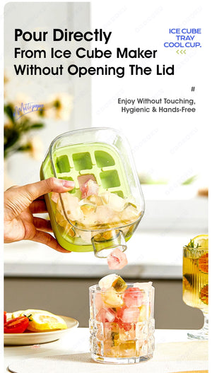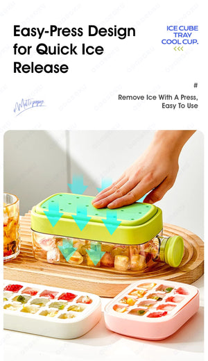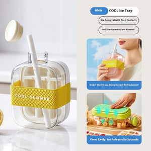 ODOROKU Ice Cube Bottle 2 in 1 Zero Touch Press Ice Cube Mold Water Bottle with Lid and Bin, Ice Bottle Cup, Easy Press to Release Vertical Ice Cube Tray with Lid for Freezer